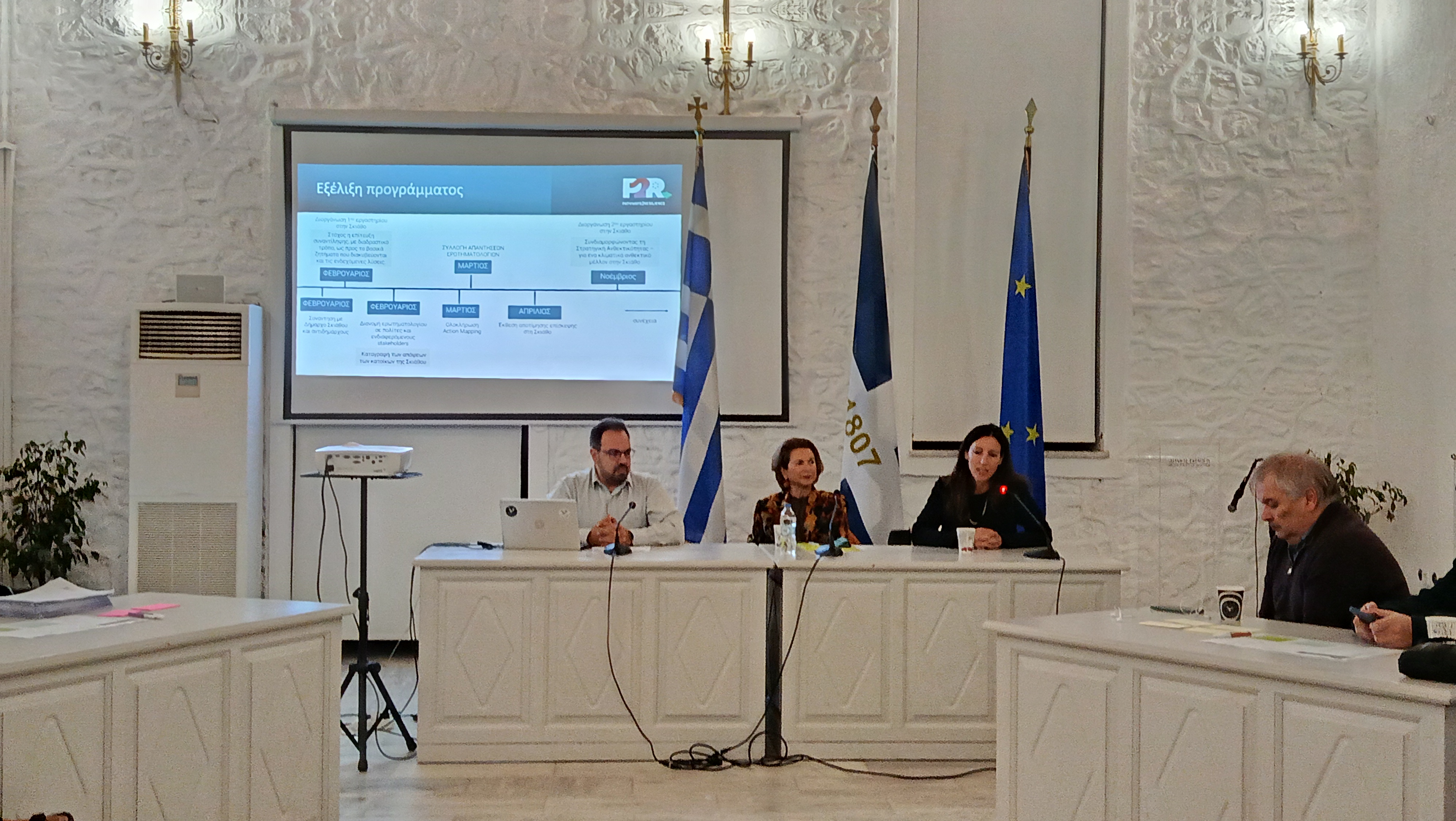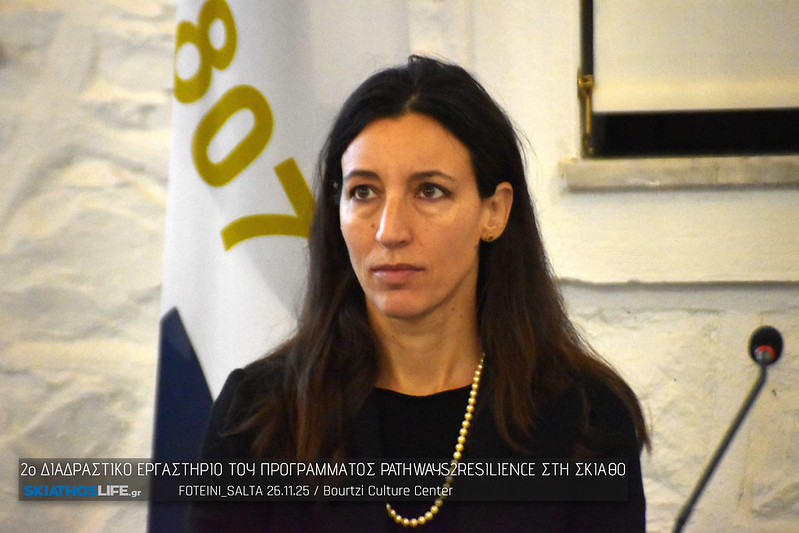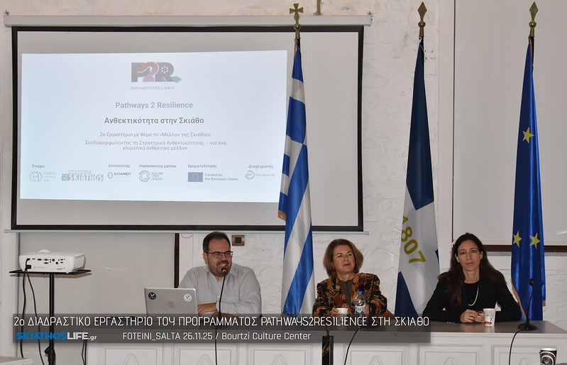 Στη συνέχεια ακολούθησε  παρουσίαση των αποτελεσμάτων του πρώτου εργαστηρίου που έλαβε χώρα στις 17 Φεβρουαρίου 2025, από τους Κωνσταντίνα Καρύδη, Διευθύνουσα Σύμβουλο Resilient Cities Catalyst Europe & Αντιπρόεδρο Κόμβου Κλιματικής Αλλαγής και Αναστάσιο Βαλβη, Project Manager στη Δ/νση Στρατηγικής και Καινοτομίας της Ε.ΥΔ.Α.Π. Α.Ε.. Κατά το πρώτο εργαστήριο οι συμμετέχοντες φορείς και πολίτες της Σκιάθου ιεράρχησαν τις σημαντικότερες για αυτούς κρίσεις και πιέσεις που δέχεται το νησί.  Αναφερόμενος στην ενδελεχή χαρτογράφηση των δράσεων του Δήμου για την αντιμετώπιση της κλιματικής αλλαγής, που παρουσιάζονται  στην πλατφόρμα  cchub.eu , ο Δήμαρχος παρουσίασε εν συντομία τις κυριότερες παρεμβάσεις που υλοποιούνται στο νησί.