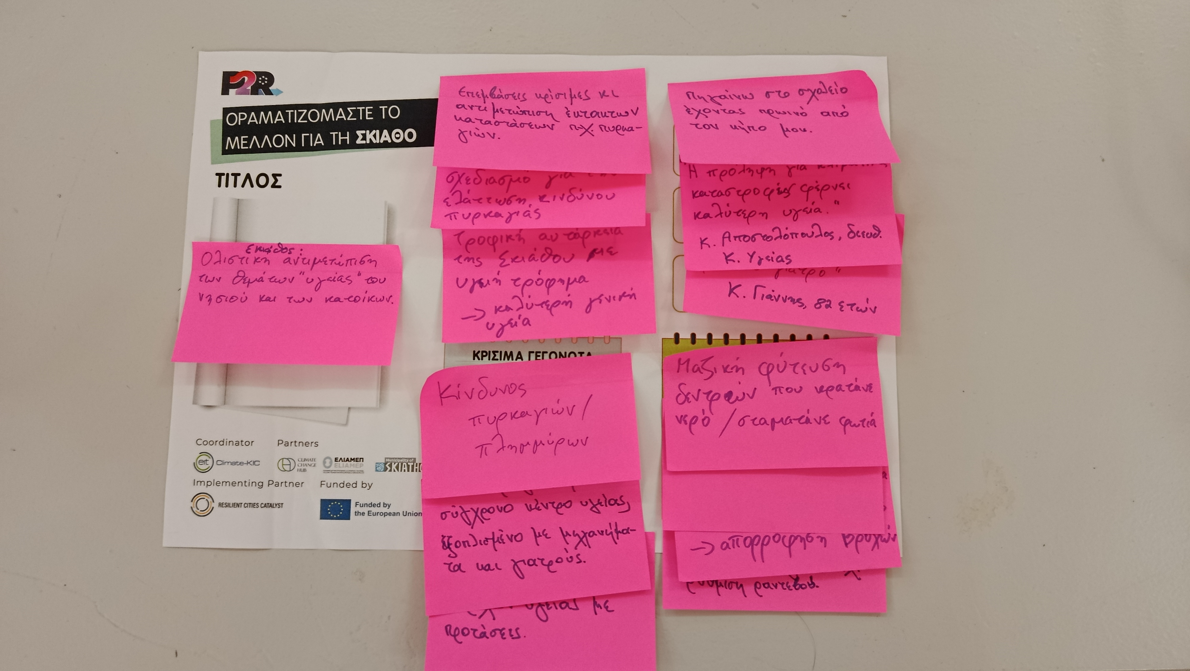 Ακολούθησε η διαδραστική άσκηση με τη συμμετοχή όλων των παρισταμένων οι οποίοι κλήθηκαν να φανταστούν από κοινού ποιο θα ήταν το ιδανικό μέλλον  μετά από 10 χρόνια για  τη Σκιάθο αξιοποιώντας συμμετοχικά και οπτικά εργαλεία, τα οποία ενεργοποιούν τη συλλογική σκέψη για  τη διαμόρφωση μιας στρατηγικής ανθεκτικότητας.