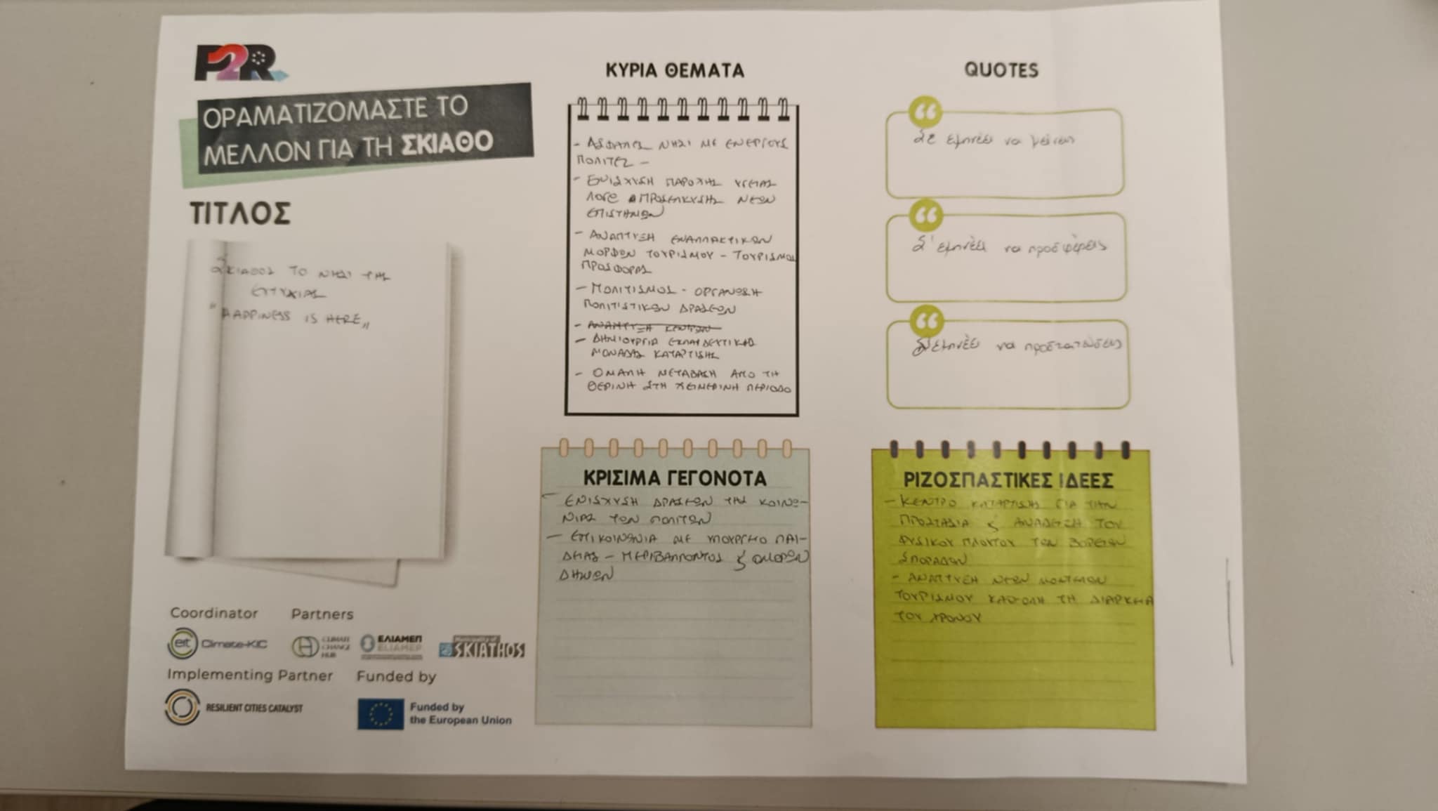 Αποτέλεσμα της διαδραστικής άσκησης με τίτλο Οπτική Ιστορία - Δημιουργία αφηγήματος για το μέλλον της Σκιάθου με βάση επιλεγμένα κοινωνικά και κλιματικά ρίσκα» ήταν η δημιουργία τεσσάρων διαφορετικών  οραματικών προτάσεων για το μέλλον της Σκιάθου από τις 4 υποομάδες που αποτυπώνονται, ως εξής: