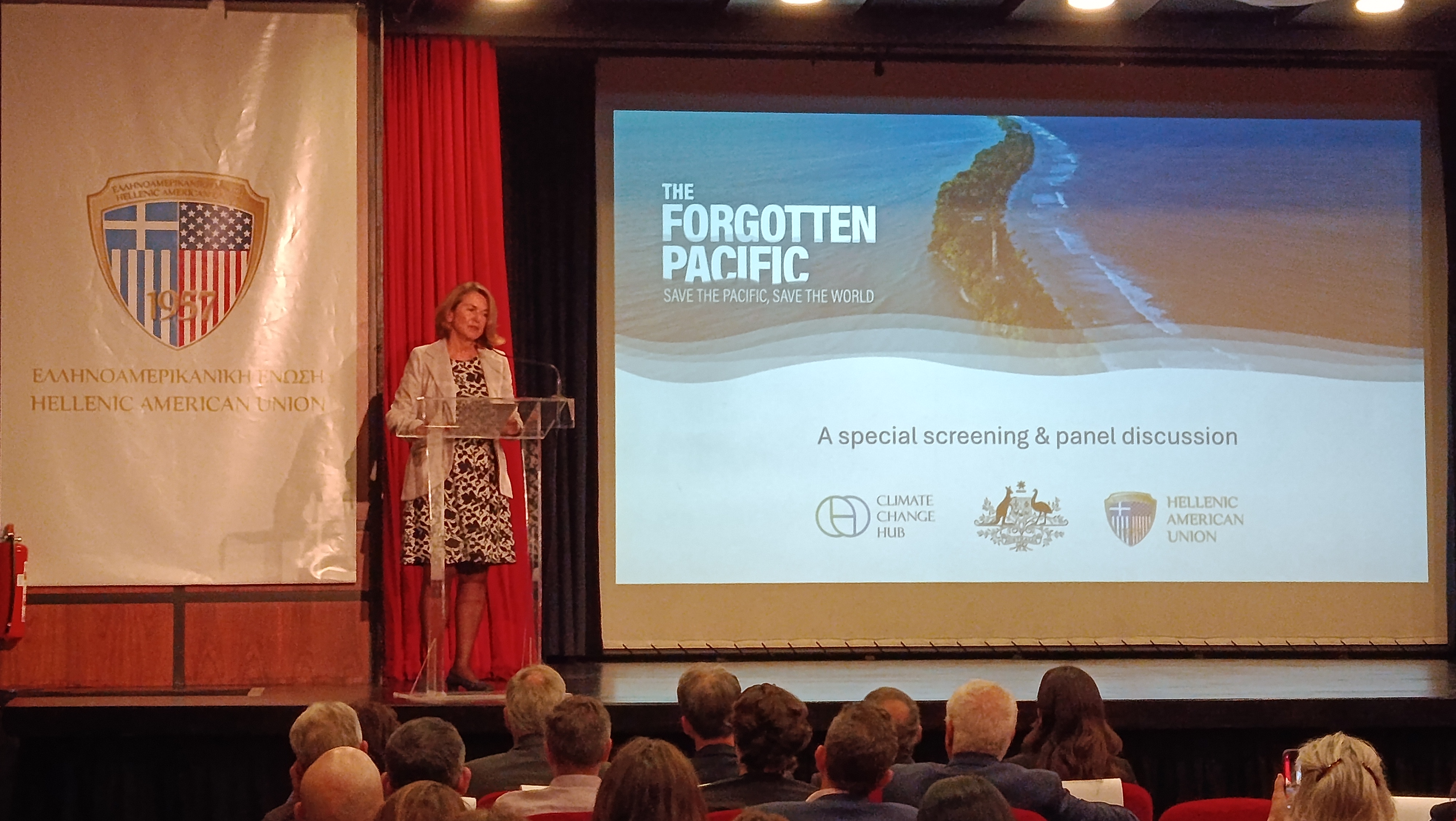 Με επιτυχία πραγματοποιήθηκε την Πέμπτη 23 Οκτωβρίου η εκδήλωση που διοργάνωσε η Πρεσβεία της Αυστραλίας στην Αθήνα, σε συνεργασία με τον Κόμβο Κλιματικής Αλλαγής και με την υποστήριξη της Ελληνοαμερικανικής Ένωσης στο πλαίσιο της κοινής υποψηφιότητας της Αυστραλίας μαζί με τα νησιωτικά κράτη του Ειρηνικού για τη ανάληψη της διοργάνωσης της COP31 το 2026. Η προβολή του ντοκιμαντέρ “The Forgotten Pacific” της Elizabeth Koroivulaono είχε στόχο να αναδείξει την επείγουσα ανάγκη για λήψη παγκόσμιας δράσης για το κλίμα και τη σημασία των διεθνών συνεργασιών, μέσα από τις δραματικές εικόνες της ζωής σήμερα στα Νησιά του Ειρηνικού.