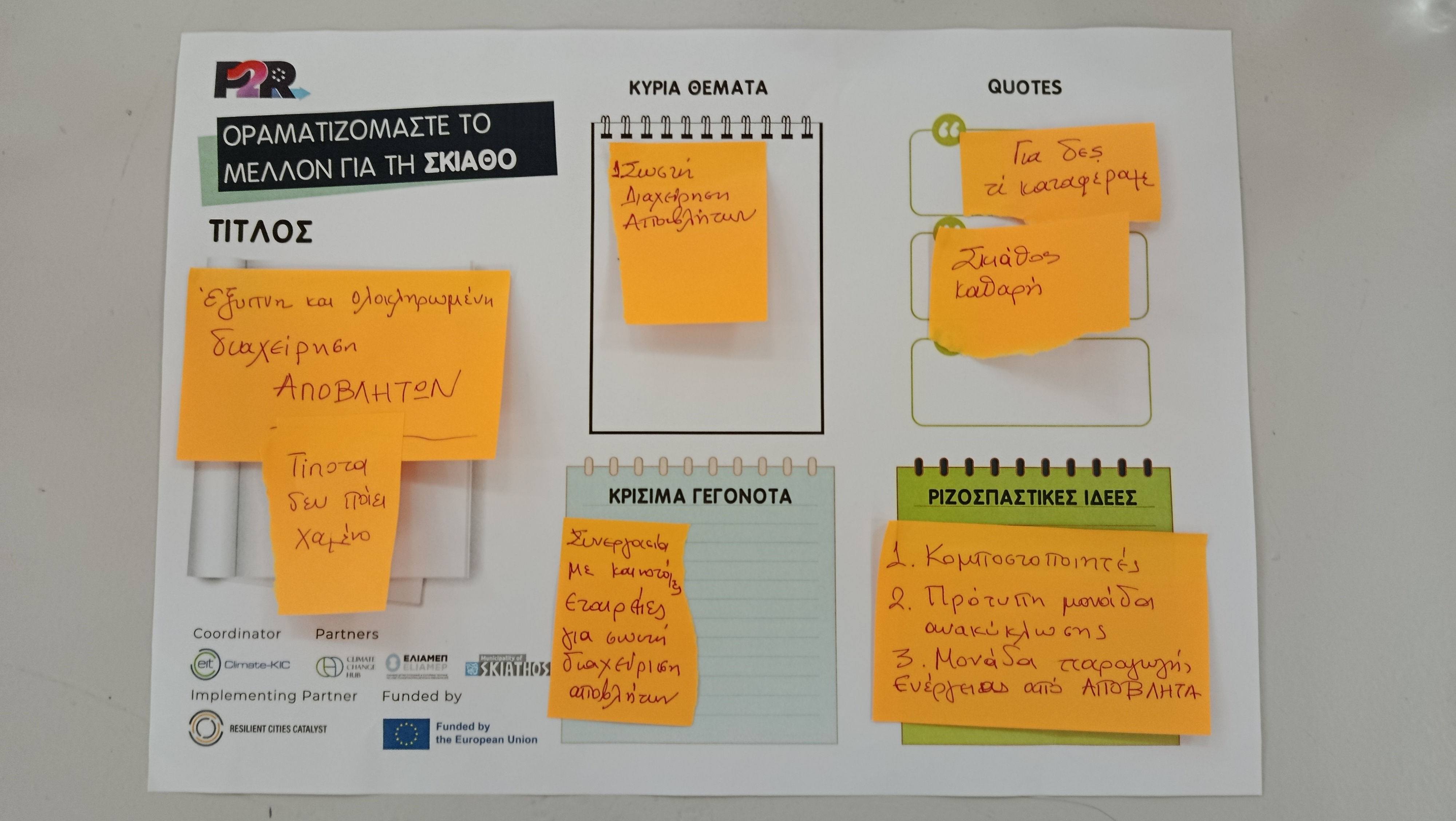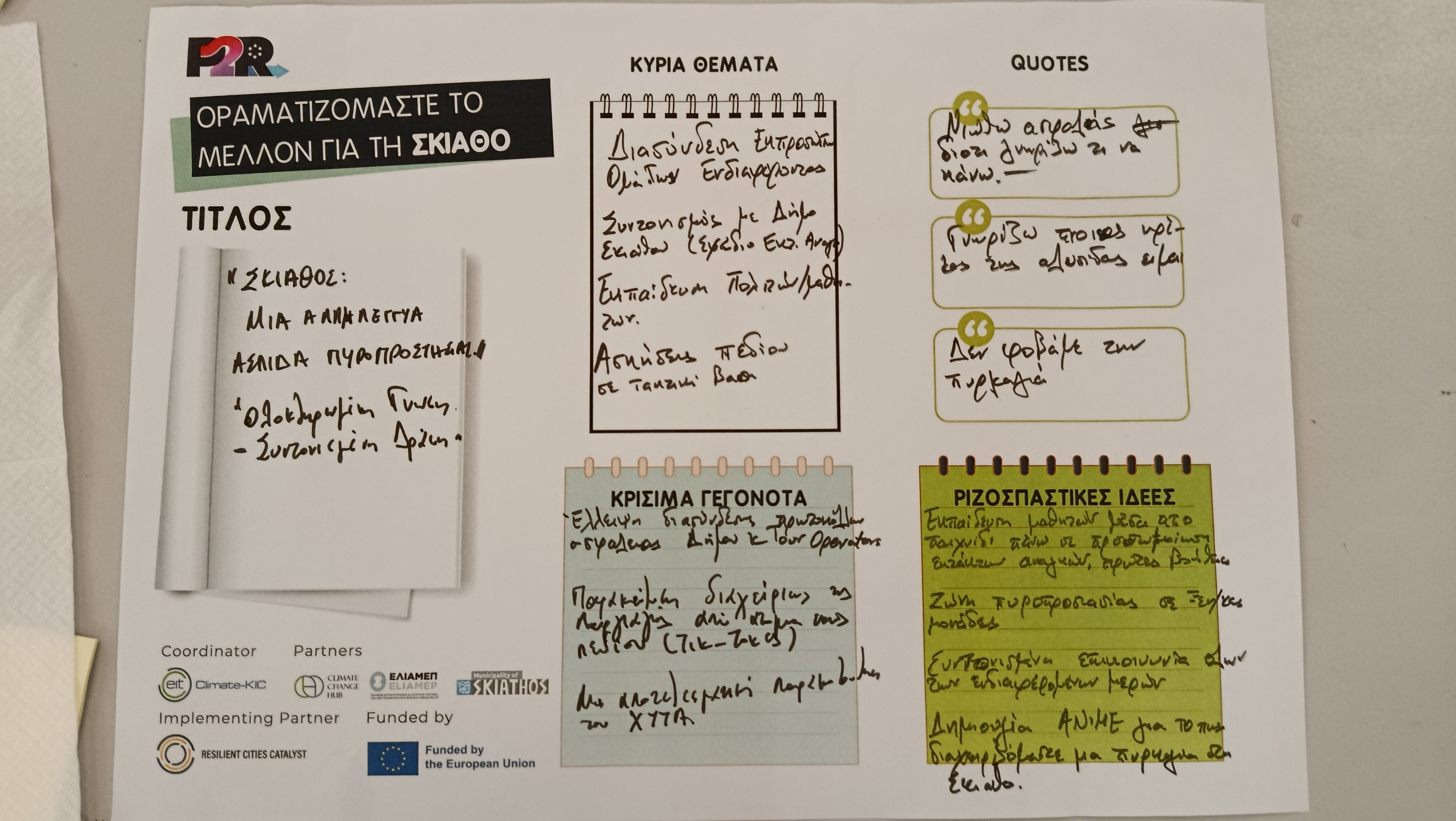 Ακολούθησε η διαδραστική άσκηση με τη συμμετοχή όλων των παρισταμένων οι οποίοι κλήθηκαν να φανταστούν από κοινού ποιο θα ήταν το ιδανικό μέλλον μετά από 10 χρόνια για τη Σκιάθο αξιοποιώντας συμμετοχικά και οπτικά εργαλεία, τα οποία ενεργοποιούν τη συλλογική σκέψη για τη διαμόρφωση μιας στρατηγικής ανθεκτικότητας.
