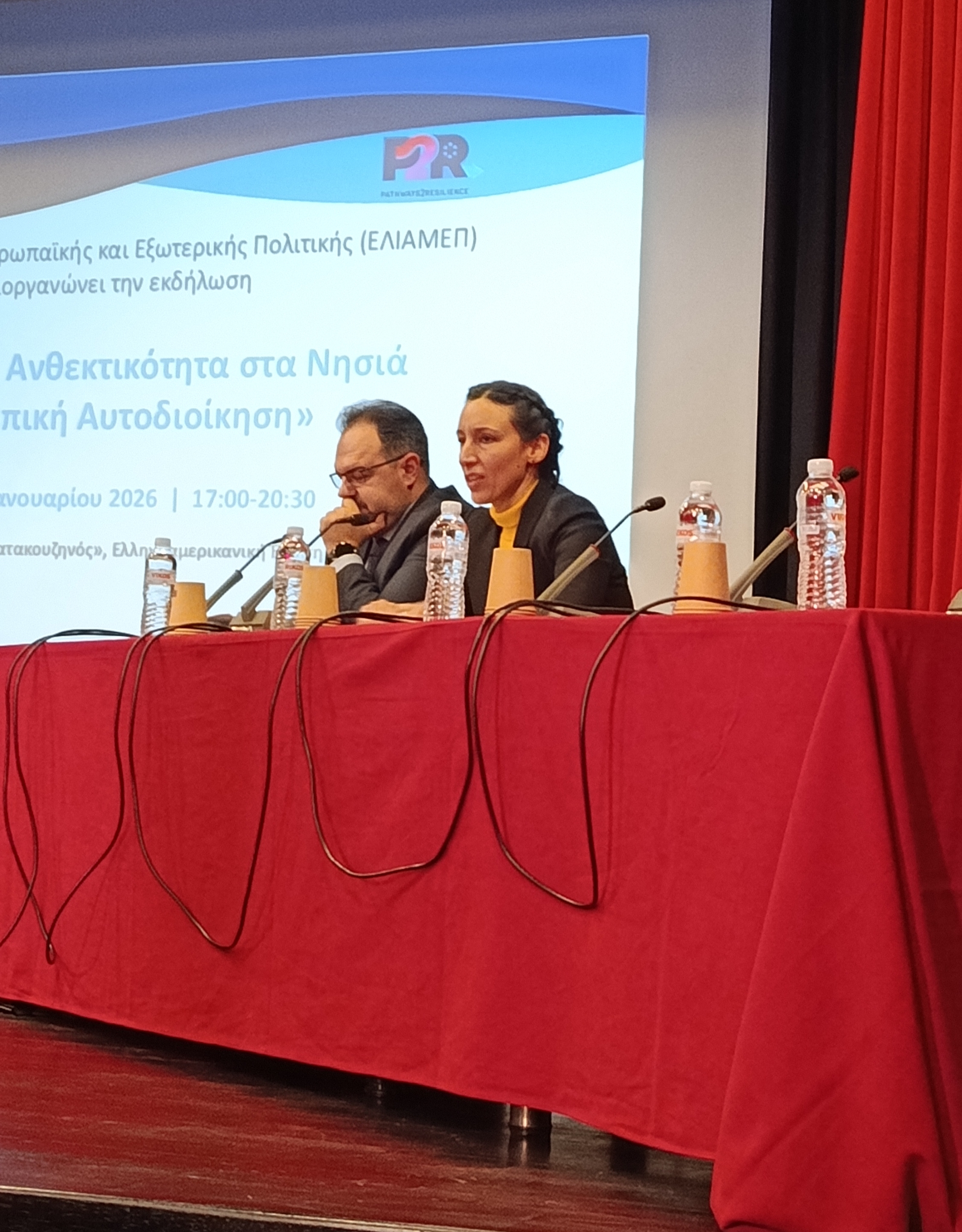 Η κα Έλενα Λαζάρου, Γενική Διευθύντρια του ΕΛΙΑΜΕΠ, κύριου διοργανωτή της συγκριμένης εκδήλωσής, απηύθυνε χαιρετισμό, ενώ η κα Κωνσταντίνα Καρύδη Εκτελεστική Διευθύντρια του Resilient Cities Catalyst, και Αντιπρόεδρος του Κόμβου Κλιματικής Αλλαγής έθεσε το πλαίσιο της συζήτησης μέσα από μια διαχρονική και συνολική αναφορά στην έννοια της ανθεκτικότητας. Στη συνέχεια ο κ. Αναστάσης Βάλβης, Επίκουρος Καθηγητής (εκλεγμένος) στη Διπλωματία και τη Διεθνή Οργάνωση, Πανεπιστήμιο Πελοποννήσου και project manager του έργου SMILE μίλησε για τα μέχρι σήμερα συμπεράσματα από την υλοποίηση του πρόγραμματος P2R στα νησιά Ιθάκη και Σκιάθο.